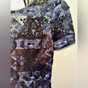 BCBGMAXAZRIA Samara gunmetal combo lace and sequined knee-length evening dress, size 0. Good used condition with some signs of wear. It was only worn once, but because the dress is delicate, there is some pilling by the arms and toward the bottom of the dress (I did my best to capture this in photos). It’s really not visible to the naked eye while wearing, just while doing a close inspection. The dress is made of polyester and nylon, and it is lined.