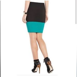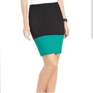 BCBGMAXAZRIA Green Scarlett Colorblock Power Skirt Featuring a high-rise elastic waistband, color-block construction and a formfitting silhouette; pair this bright color-block skirt with a coordinating blazer for cool weekday style. Measures approximately 23" from waistband to hem rayon/nylon/spandex machine wash imported. Color: black/ teal.