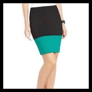 BCBGMAXAZRIA Green Scarlett Colorblock Power Skirt Featuring a high-rise elastic waistband, color-block construction and a formfitting silhouette; pair this bright color-block skirt with a coordinating blazer for cool weekday style. Measures approximately 23" from waistband to hem rayon/nylon/spandex machine wash imported. Color: black/teal. Size L (will fit M nicely 😉)