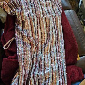 Shine bright in this dazzling BCBGMAXAZRIA wrap dress featuring vertical and diagonal sequin stripes in blush, cream, and silver tones. With a flattering V-neckline, spaghetti straps, and a form-fitting silhouette, this dress is perfect for any special occasion.