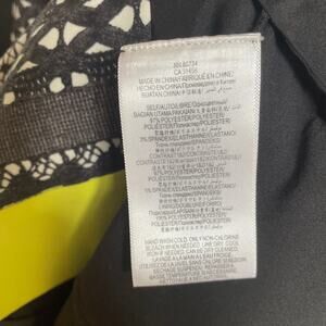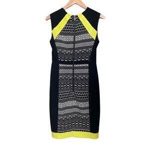 This BCBGMAXAZRIA sheath dress in size 4 features an elegant black, white, and charcoal lace-inspired print with bold neon yellow accents. The Y2K inspired colorblock design is ultra flattering, giving a slimming silhouette ideal for work, events, or cocktail settings. Structured, this fully lined dress has a full zip back and hits just at the knee.