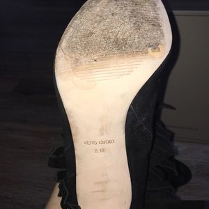 BCBGMAXAZRIA size 8 suede black open toe fringe booties. In great condition, as you can see was worn only a couple times. Has a nice fringe, with delicate beading/studs.