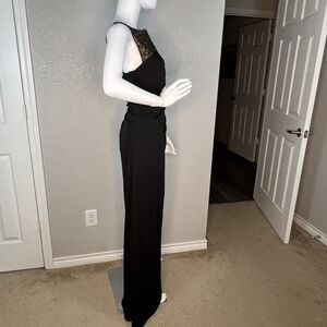 BCBGMAXAZRIA Size M Gown Asymmetric Neck Side Slit Black Open Back Gold Sequin