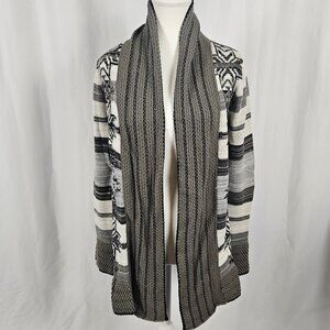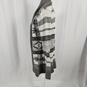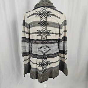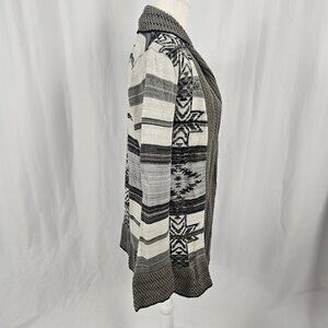 Wrap yourself in cozy style with this unique BCBGMAXAZRIA western-inspired cardigan. The geometric knit patterns and neutral color palette make it a standout piece that's perfect for layering. With a comfortable shawl collar and open front, this sweater is a versatile and stylish addition to any wardrobe.