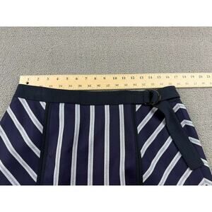 Navy and white striped A-line skirt with mixed directional panels, grosgrain D-ring belt at waist, and layered ribbed hem. Tailored, modern preppy vibe—great for office or smart casual looks.