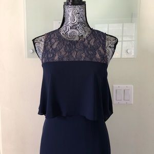 Lace at neckline and back; overlay at chest; ruffles at back; slit at front hem