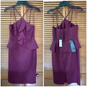 An elegantly draped ruffle bodice and peplum are complimented by a seductive keyhole front and open back.