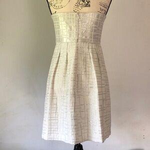 White and silver printed strapless dress by BCBGMAXAZRIA with empire waist and corseted bust.