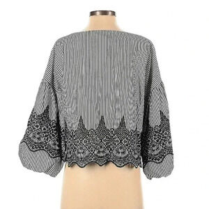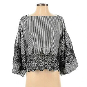 BCBGMAXAZRIA | Striped Cropped Bell Puff Sleeve Embroidered Blouse Size XS Boho