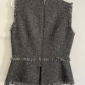 This textured peplum top has fringe detailing and is super flattering. It material looks like tweed boucle and is a cotton blend.