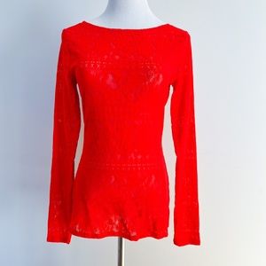 BCBGMAXAZRIA | WYLIE Bright Red Stretch Long Sleeve Textured Semi Sheer Lace Top