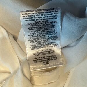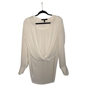 This white blouse from BCBGMaxAzria showcases a chic draped front design, offering a sophisticated silhouette. The soft, flowing fabric adds a touch of elegance, making it a versatile piece for various occasions. Long sleeve, button detail on wristband, high low blouse, draping