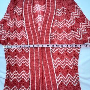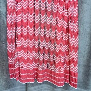 BCBGMAXAZRIA Women Open Knit Chevron Collared Cardigan Sz L Coral Orange White