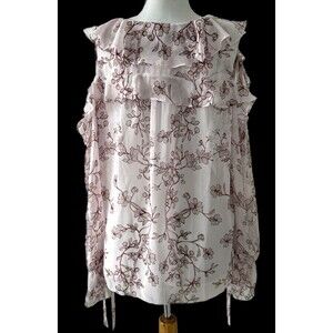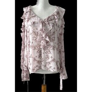 - Pink blouse with flower pattern.Long sleeves, cold shoulder, ruffle neck ,chiffon. Size Large
