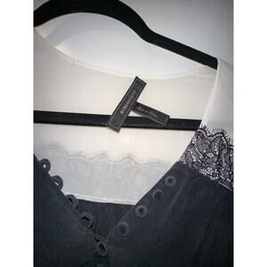 Pre-owned product, in excellent condition, with minimal signs of use. BCBG silk blouse features long sleeves with black lace detailing, sheer white trim, and a V-neck with buttons. Product measurements: Shoulder to shoulder: 41cm, Width: 104cm, Height: 69cm, Label: XS. Does not include a dust bag.