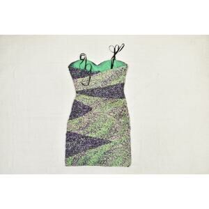Look stunning in this pre-owned BCBGMAXAZRIA bandage dress, perfect for a night out or a special occasion. The dress features a vibrant green and purple abstract pattern with a stylish V-neckline and black spaghetti straps. Crafted from a blend of nylon and spandex, the material offers a bodycon fit that hugs your curves for a flattering silhouette. The dress is in excellent used condition with no visible stains or tears. The short mini length and sleeveless design make it a great choice for warmer weather or pairing with a jacket. Features include a hidden back zipper for easy wear and a lined interior for comfort. This designer dress is a must-have for any fashion-forward wardrobe. See photos for accurate measurements and details. Measurements: Armpit to Armpit 14.5 inches, Dress Length 28 inches. Made in China.
