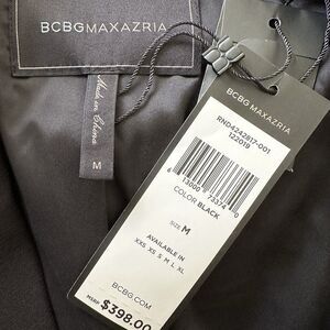 BCBGMAXAZRIA Women’s Lace Hem Double Breasted Blazer Black Size M NWT MSRP $398. New blazer that can be worn as a dress, polyester, nylon & spandex. Approx. measurements: pit to pit 19, sleeves 24", length from front 34", from back 43".