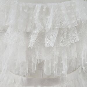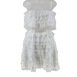 This mini dress is made with layers of ruffles in lace. The strapless bodice is accented with a sheer panel revealing the corset at the waist, the skirt falls in layers with ruffles above the knee.