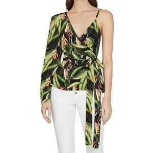 BCBGMAXAZRIA Women's Sz S Black Bird of Paradise One Sleeve Printed Top