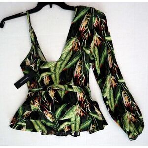 BCBGMAXAZRIA Women's Sz S Black Bird of Paradise One Sleeve Printed Top