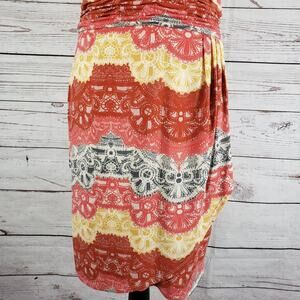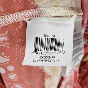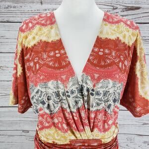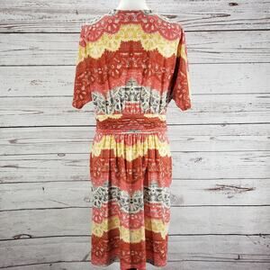 BCBGMAXAZRIA- Women's Tereza Curry Red Surplice Neck Faux Wrap Dress Size Large. Polyester, spandex fabrics. Approx. measurements pit to pit 20 in. Waist 30 in. Dress length 38 in. Pre-owned in good condition, no holes or stain.