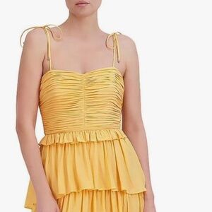This is a BCBGMAXAZRIA women's sleeveless midi dress in size 4. It features a tiered design with a sweetheart neckline and a solid yellow color. The dress has a zip closure and falls to a midi length. The style is a sundress with layered accents, perfect for a stylish and elegant look. Very Soft and comfortable