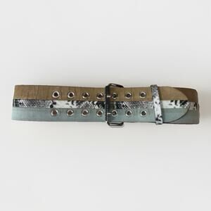 Chic BCBGMAXAZRIA wide waist belt in size XS/S. Features a unique colorblock design with tan, light blue, and black/white snakeskin accents. Crafted from quality faux leather with a shiny silver double-prong buckle and reinforced grommets for adjustability. Perfect for styling over dresses, skirts, or with high-waisted jeans for a bold statement look. Pre-owned, excellent condition with minimal wear (see photos).