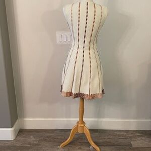 BCBGMAXAZRIA cream with different color brown embroidered lines fit and flare dress. Sleeveless, 76% rayon, 22% nylon and 2% spandex ribbed sweater material. Great weight for all seasons, can be worn with boots or sandals.
