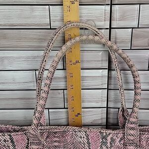 Pink faux snakeskin print top handle tote by BCBGmaxazria with tan lining, one inside zip pocket, and 3 outside slip pockets. Fun bag and large enough for everything. Good pre-owned condition. Some minimal color fading on top handles and edges.