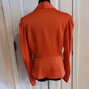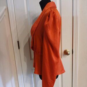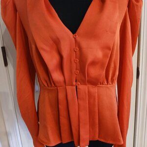 BCBGMAXAZRIA orange pleated peplum button-up silky blouse with puff sleeves Sz S