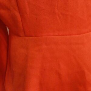 BCBGMAXAZRIA orange pleated peplum button-up silky blouse with puff sleeves in size small. There are a couple of small untreated oil-looking stains on the back and a couple of pulls. See pictures.