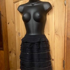 Black hortizonal ruffles with clear bugle beads on 3 rows. Elastic waist. 100% silk outer fabric and 100% polyester lining. XXSmall. In great shape. Waist to hem 15”.