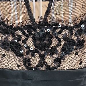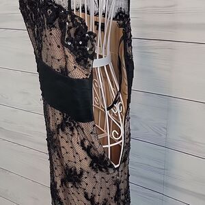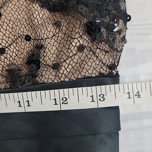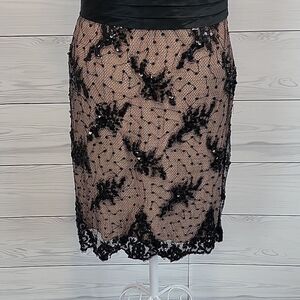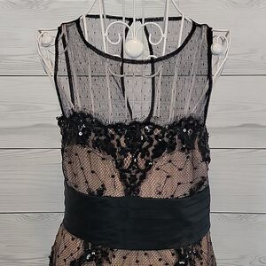 A beautifully romantic silk midi by BCBGMAXAZRIA with a black lace overlay, sequined embellished, a banded waistline, and a delicate scalloped hemline. Great pre-owned condition, but it is missing a zipper pull. It does make it hard to use.