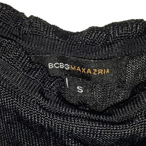 BCBGMAXAZRIA Black adjustuble spaghetti straped knit tank top. Small ruffle on neckline and bottom on tank top. See picture for close up of fabric. Great staple for every closet. Size S