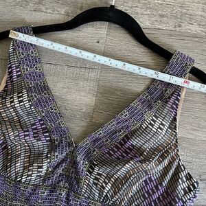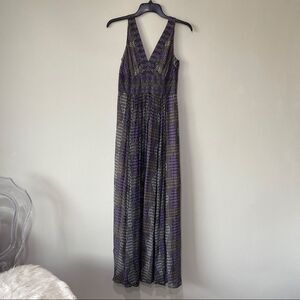 Long floor length silk maxi gown with a geometric print in dramatic shades of brown and purple with metallic gold and silver threads throughout for a shimmering effect. Rhinestones at empire bust and beading at shoulders, v neck, sleeveless, lined. Overall excellent preowned condition.