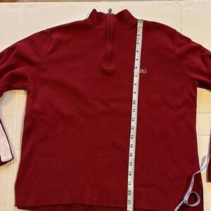 BCBGMAXAZRIA-M-Red-quarter zip, long sleeve sweater with white stripe down arms. embroidered in white BCBG. 100% cotton 3 inch slits on the sides. Really nice quality see photos for approximate flat measurements