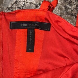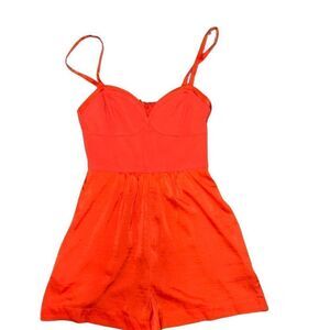 BCBG MaxAzria Bridget Romper in Bright Poppy Red featuring a high rise waist, sweetheart neckline and bustier seams that accentuates curves. It has adjustable shoulder straps and a side zipper closure.