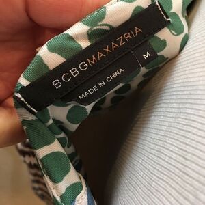 Really cute tank top from BCBG. Size medium. Square neckline in a contemporary polkadot pattern. Colors include blue green and brown on a cream background. Polyester spandex. Literally worn once. Length from shoulder down is 28 inches. I recommend this for a size 4-6.