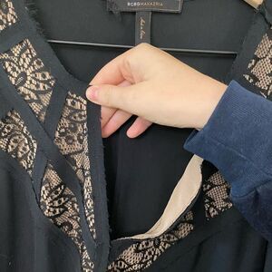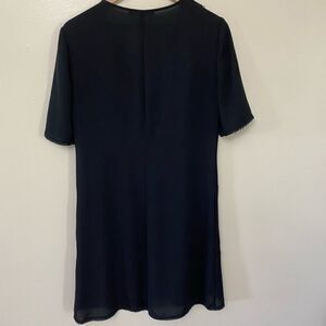 Short slevve shift dress featuring notched neckline with elaborate unlined lace panels