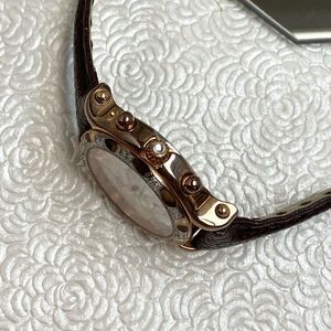 BCBGMaxAzaria crystal accented rose gold-tone stainless steel chronograph watch. Watch features a rose gold-tone stainless steel case accented with crystals around the bezel. The textured dial has sub-dials for second hand, stopwatch function and a date indicator at 4 o'clock. The screw-down case back is marked, "BCBGMAXAZARIA, Stainless Steel, U54-05, BG6042, 30 Meters Water Resist, Japan Movement." The watch case measures approx. 37.8mm across excluding the crown and pushers, and the total length of the watch with original leather strap is approx. 8 1/4" (maximum wrist size of approx. 6 1/2"). Watch is in good condition with a scratch-free crystal and light scuffs / scratches to the case and case back. Watch has a new battery, keeping time and date indicator and stopwatch function are working as they should. Thanks for checking out my closet!