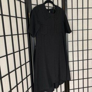 Black short sleeve hi-low round neckline dress. Has cute see through knit detail on chest and sleeves. Button for closure on back. In excellent preowned condition.