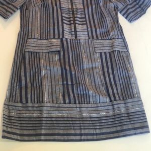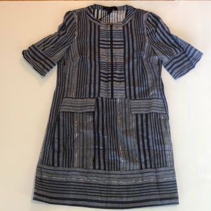 Center Front Zip Closure, Bold Stripes with hint of Metallic, Short-Sleeve Shift Dress, Modern Look, Edgy
