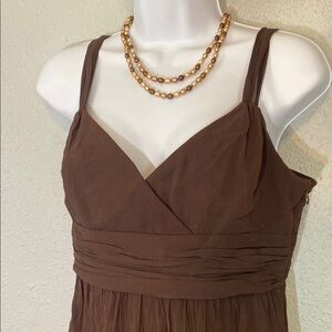 This elegant brown midi dress by BCBGMaxAzria is perfect for wedding guests, featuring a tiered, ruffled design that exudes sophistication. The sleeveless style with a sweetheart neckline and spaghetti straps offers a chic and modern look. Ideal for cocktail events, this sundress combines style and comfort effortlessly. Size 8. Pit to pit 17”. Shoulder to hem 37”. Under bust 15”.