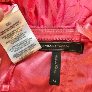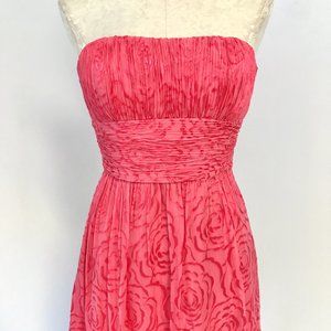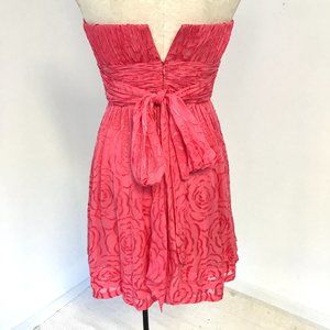 BCBGMaxAzria strapless pink dress w empire waist & tie back bow sash. All-over rose print on sheer burnout velvet overskirt. LOVE this cute sexy number for a summer event or Valentine's Day! EUC.