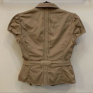 Unique, casual suit jacket featuring short puffy sleeves and a tie at the waist for something a little extra.