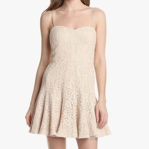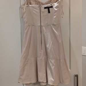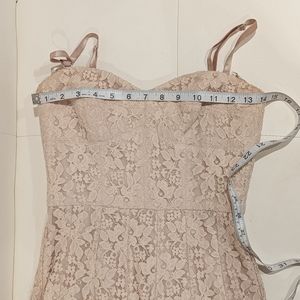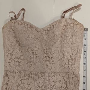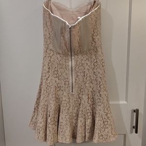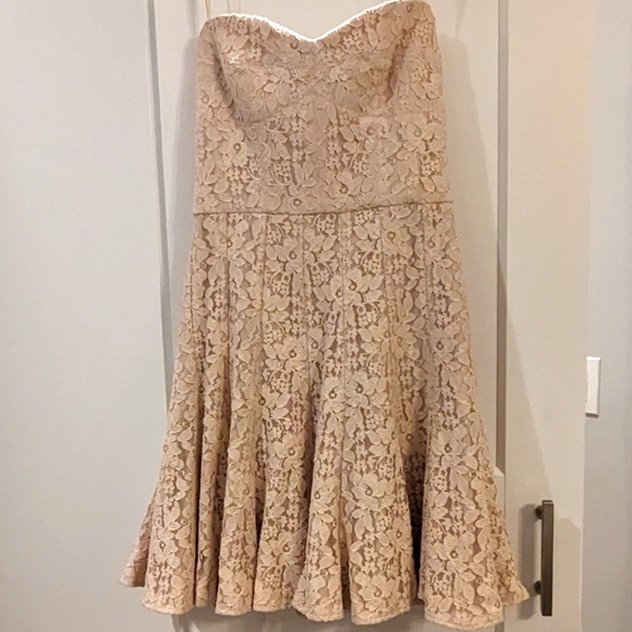 BCBG MaxAzria lace dress. This beautiful dress was worn once and in EUC. Style: Brianne Color: Almond. The straps are an optional choice or can be worn strapless. See pics for approximate measurement and also included are the lining of dress to show the great condition.