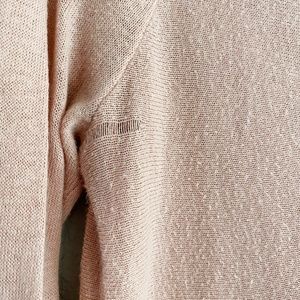 Light pink BCBGMaxAzria sweater with one open shoulder. Has one snag in corner.