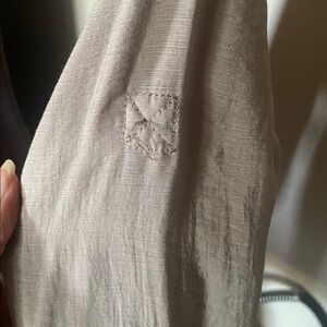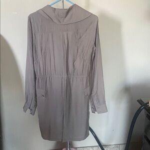 Elegant beige utility themed dress with a sleek design. Rayon nylon blend. Missing R upper arm silver decorative button.