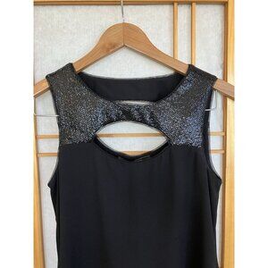 BCBGMaxAzria Bianca Top in black chiffon with sequined eyelet accents is perfect for travel, weddings, parties, casual outings, and formal events. The sleeveless design with a keyhole neckline, pullover closure and lined has a relaxed fit, making it comfortable, easy to wear and versatile. This XXSmall top from the well-known brand BCBGMAXAZRIA is made of polyester chiffon fabric. Perfect for all seasons. Measurements lying flat- 16” underarm across, 24” from shoulder to front hem, 28” shoulder to back hem. In excellent condition, no wear on this item.