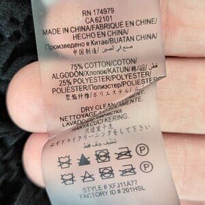 75% cotton and 25% polyester. The material has a lot of stretch. Made in China.